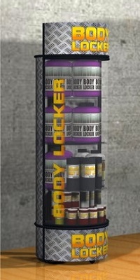 Expositor de chão para suplemento alimentar com forma redonda, c/ porta transparente e pintura eletrostática.