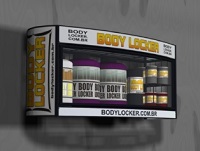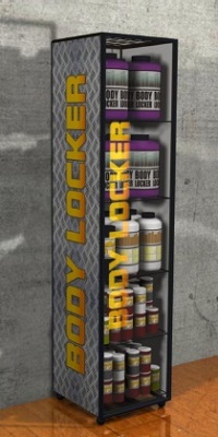 Expositor de chão para suplemento alimentar com forma retangular, c/ porta transparente e pintura eletrostática.