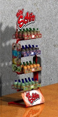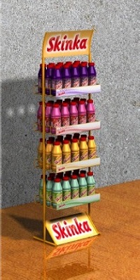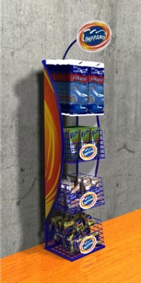 Expositor de chão personalizado para bebidas c/ 4 cestos e pintura eletrostática.